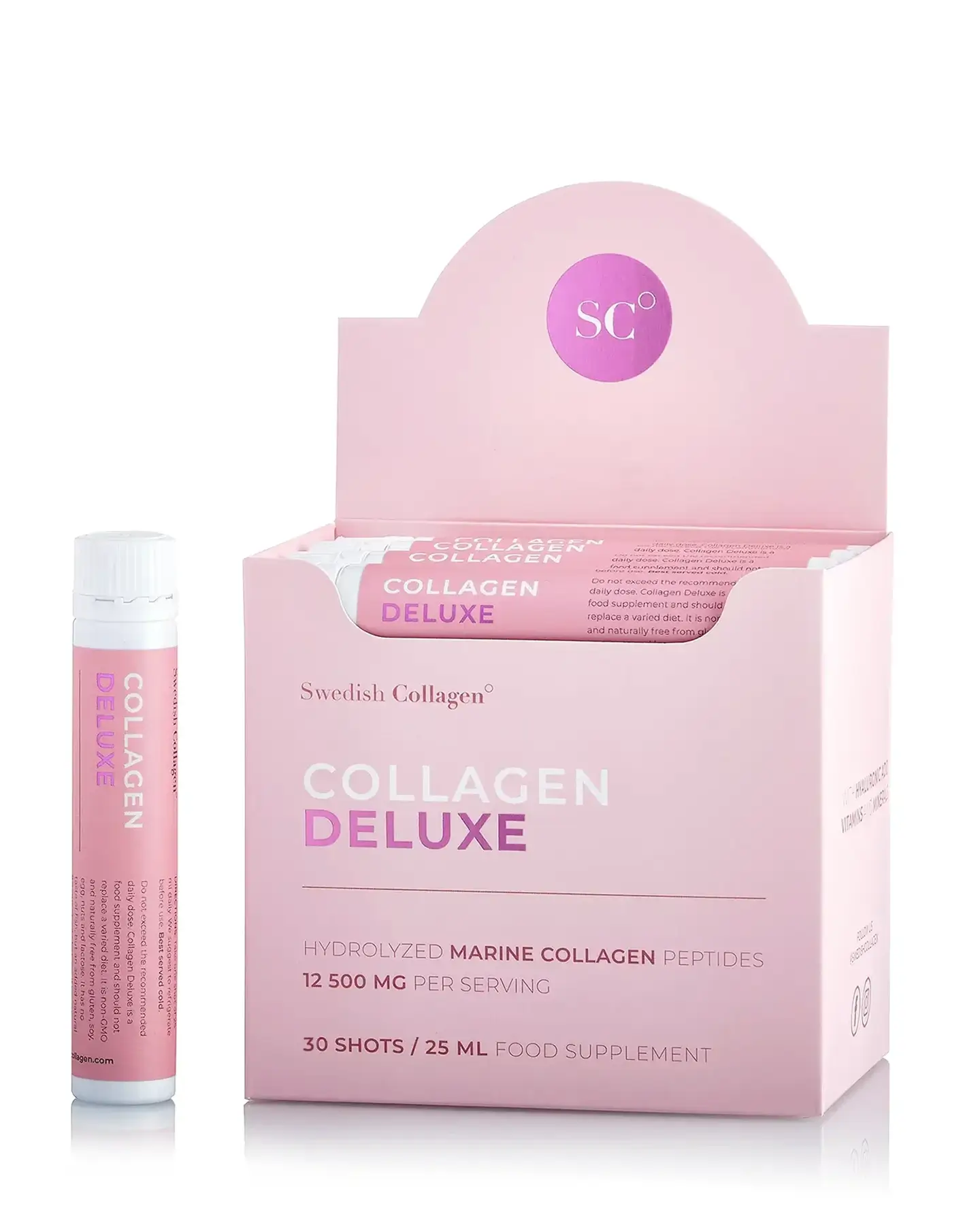 Colagen Deluxe Fiole pentru sanatate si frumusetea pielii cu efect anti-aging – contine 12.500 mg Colagen marin la zona zilnica – cea mai mare concentratie de pe piata. Ambalat in Fiole Buvabile, este usor de administrat si placut la gust, iar forma lichida ii garanteaza absorbtia maxima.