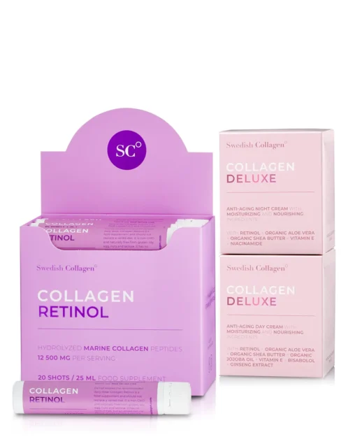 Pachetul contine: Colagenul Nostru de TOP, Colagen Retinol 20 fiole cu 12500mg de colagen lichid hidrolizat de tip 1 si 3 per fiola. Colagen Marin de cea mai inalta calitatite. Impreuna cu acest colagen, utilizeaza si Cremele de Noapte si de Zi cu formulele unice pe baza de Retinol pentru un Efect IN and OUT. Retinolul fiole asigura efectul optim din interior, iar cremele de noapte si de zi asigura efectul la exteriorul pielii.